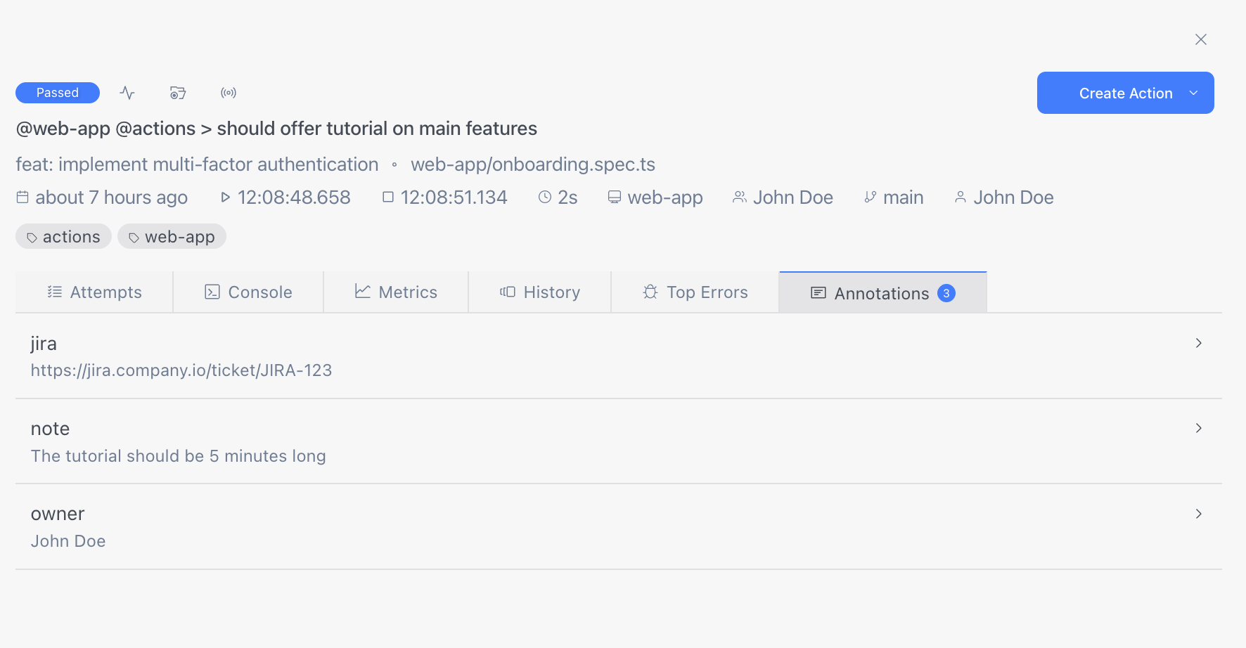 While Currents displays all the annotations related to a test, some annotation have a special meaning, for example - test owner.