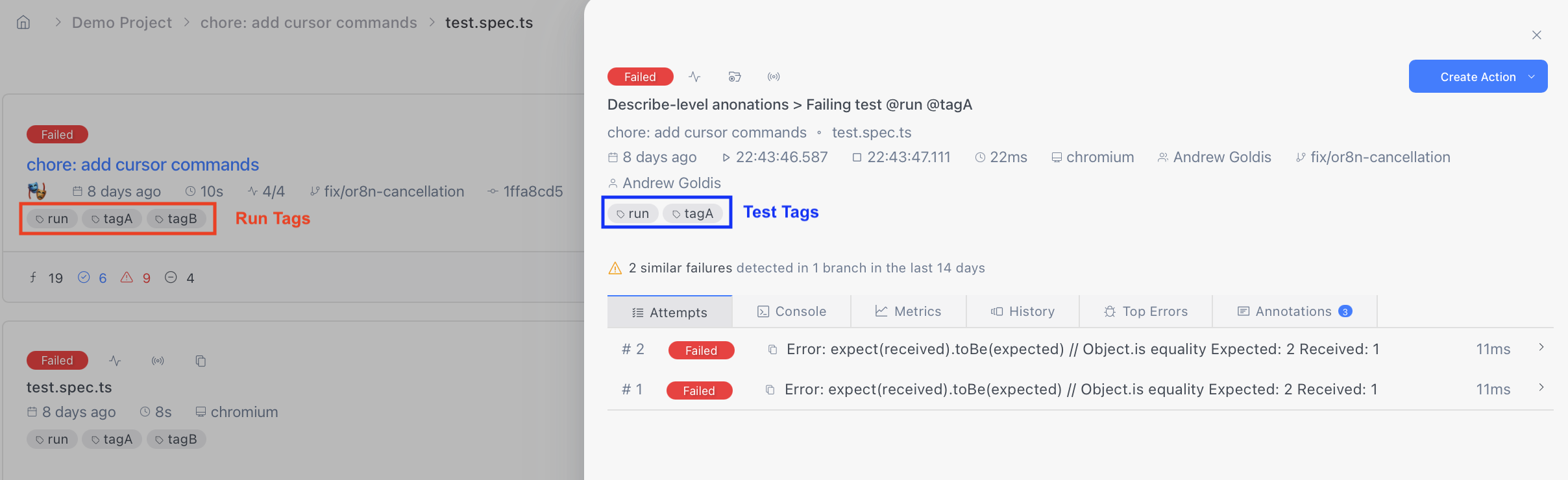 <figure><img src="https://3745692499-files.gitbook.io/~/files/v0/b/gitbook-x-prod.appspot.com/o/spaces%2FqmFDEiUa9mr11LUlxDnt%2Fuploads%2FLtMNeviBz8L7rsshRznm%2FScreenshot%202026-01-15%20at%2023.04.40.png?alt=media&#x26;token=fa4c66a8-66e6-4cce-8a39-b128f2d8727a" alt=""><figcaption><p>Example of a run created with various tags when tagging a test group</p></figcaption></figure>