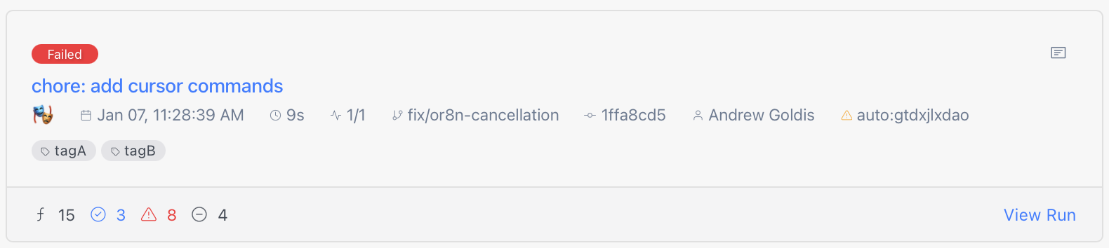 <figure><img src="https://3745692499-files.gitbook.io/~/files/v0/b/gitbook-x-prod.appspot.com/o/spaces%2FqmFDEiUa9mr11LUlxDnt%2Fuploads%2FcNbWAdsF79lKwNCPYffL%2FScreenshot%202026-01-15%20at%2018.41.06.png?alt=media&#x26;token=4ee1ce36-ea4e-496a-a776-a5febede1d26" alt=""><figcaption><p>Example of Currents run created with tags @fast and @slow</p></figcaption></figure>