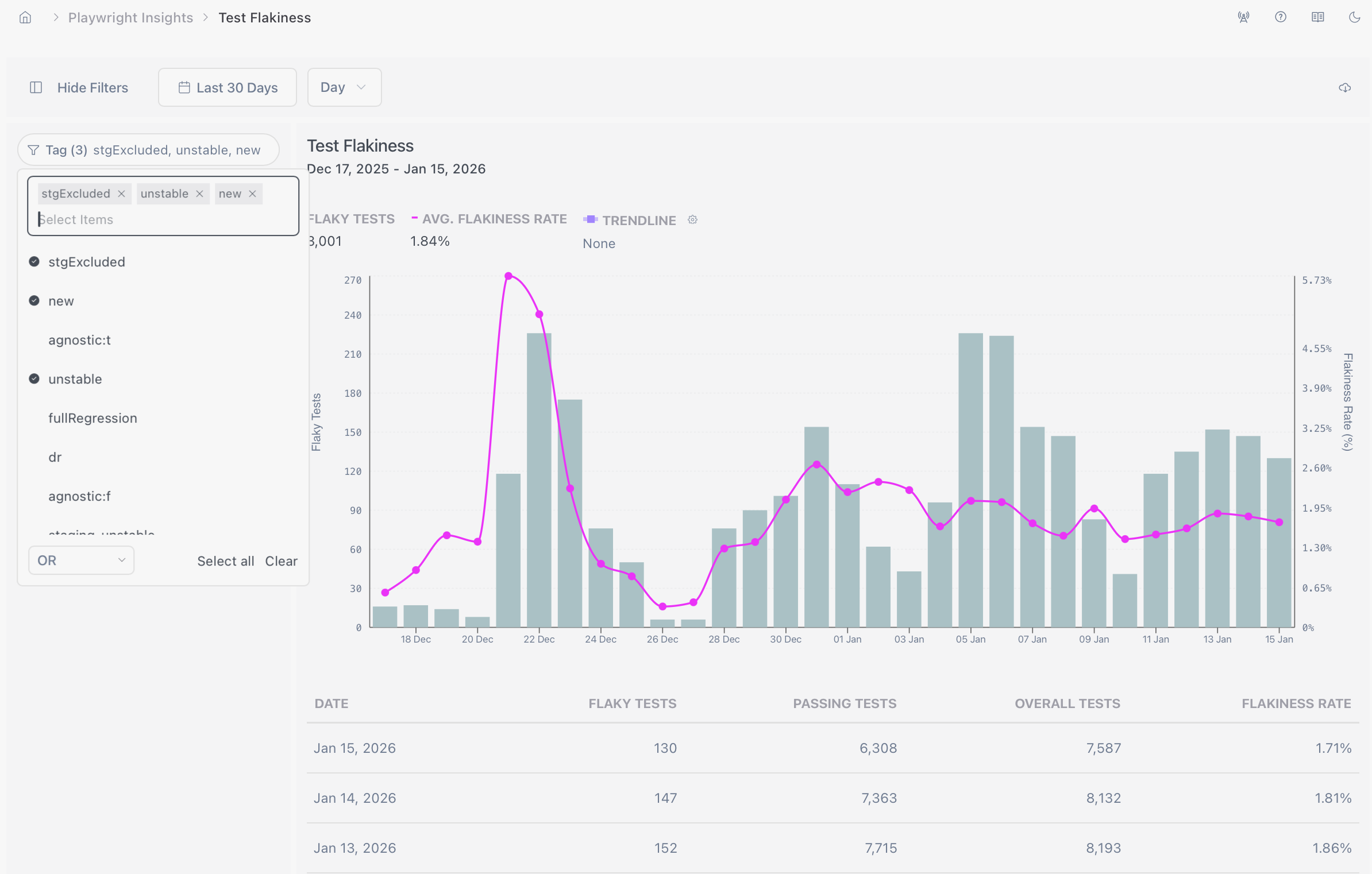 <figure><img src="https://3745692499-files.gitbook.io/~/files/v0/b/gitbook-x-prod.appspot.com/o/spaces%2FqmFDEiUa9mr11LUlxDnt%2Fuploads%2FmQOZth1k3g3h9DlAeFUG%2FScreenshot%202026-01-15%20at%2018.30.45.png?alt=media&#x26;token=887bed82-d827-4fed-8f98-fc489195e3f1" alt=""><figcaption><p>Example of using Tags for narrowing down Flakiness chart in Currents Dashboard</p></figcaption></figure>